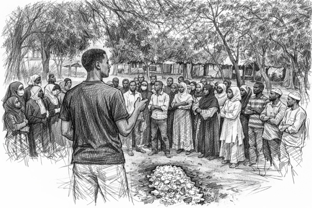 En passant dans un quartier voisin à l’école, pleurnichant, il attire l’attention d’un groupe de jeunes hommes, assis là, prenant le classique thé.